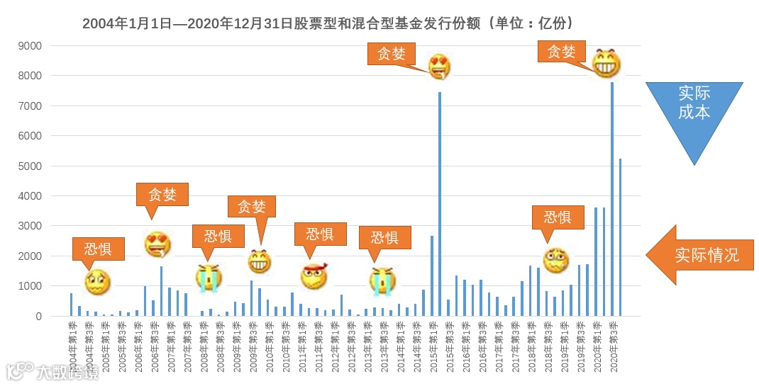 下图是沪深300指数走势和同期股票型和混合型基金发行规模的对比图,从图中可知,人们总是在市场低点位,适合布局的时候,因为恐惧而不敢有所作为;在市场高点位,应该感到恐惧时,反而疯狂地买入。要低买高卖、逆势布局的道理谁都明白,但追涨杀跌才是人之天性,要做到逆势布局,就必须要与人类几千万年进化而形成的本能作斗争,难度可想而知。因此,不难想象,短期择时想要低买高卖常常演化成追涨杀跌。