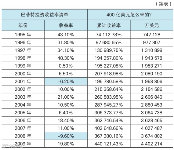 从上图可知,巴菲特的投资收益只有一年超过了50%,并且多集中在10%~20%这个区间。百分之十几的收益情况,在牛市中很多股民可能都看不上。但这样的成绩,在45年间,让他的资产从1000万美元翻升至440亿美元,一度成为世界首富。巴菲特的例子告诉我们,要获得高收益确实不一定要通过高风险的博弈,也可以通过长期投资和复利获益来获得。