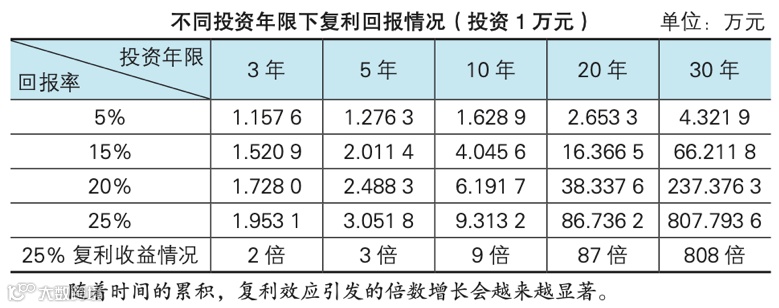 上表是以1万元为本金,在不同的投资年限下的复利回报情况。从表中我们可以很明显地看到,随着时间的累积,复利效应引发的倍数增长会越来越显著。以每年25%的复利计算,3年可以翻约1倍。10年能增长到9倍,而到了第30年,能增长到惊人的808倍。换句话说,若在20岁时,投资100万元在年复利25%的产品上,到了30岁,将拥有900万元,而到了50岁,将有约8.08亿元。若投资相对稳健的年利率约5%的品种,30年也可增长到4.3倍之多。