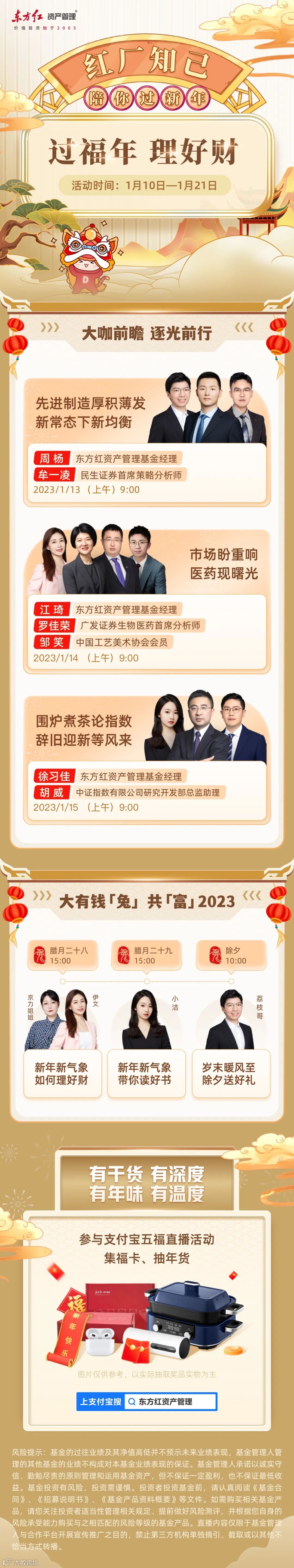 “红厂知己陪你过新年——过福年 理好财”,东方红资产管理支付宝五福系列专场直播活动拉开帷幕。1月10日-1月21日,进入支付宝-东方红资产管理财富号,参与新年开福袋活动、预约并大咖直播,有机会抽坚果投影仪、airpods第三代、摩飞多功能料理锅等年货好礼!