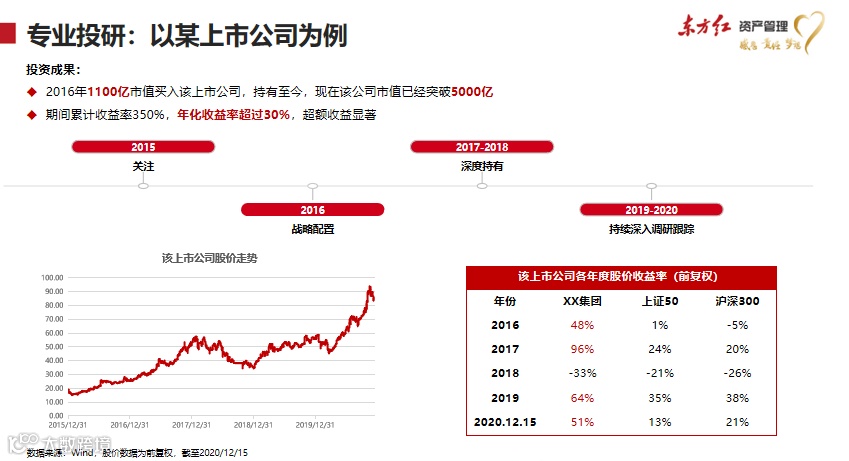 因为投研是一个非常专业的领域,我们先要让投资者知道投研到底是什么样的过程,就好像你去做手术,你知道要麻醉、上手术台、要开刀、要缝合,你就知道他的专业性,你就自然不会自己去做,你就会尊重专业、交给专业。首先我们东方红资产管理跟客户强调的是我们这个行业是专业的行业,专业投研,我们是“手艺人”,这是专业致胜的行业,所以东方红资产管理一直都告诉大家,我们的做法是从行业里面找到长期超越行业平均水平的优秀公司,然后用合适的价值买入,可能大家也都是这么做的,要不然不可能业绩都这么好。我们的业绩也不错。