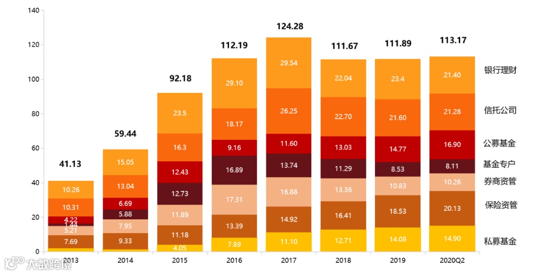 图1:2013-2020年2季度我国主要资产管理行业管理规模增长(单位:万亿);2018年起银行理财规模不计入保本产品(2018年约为10万亿)。