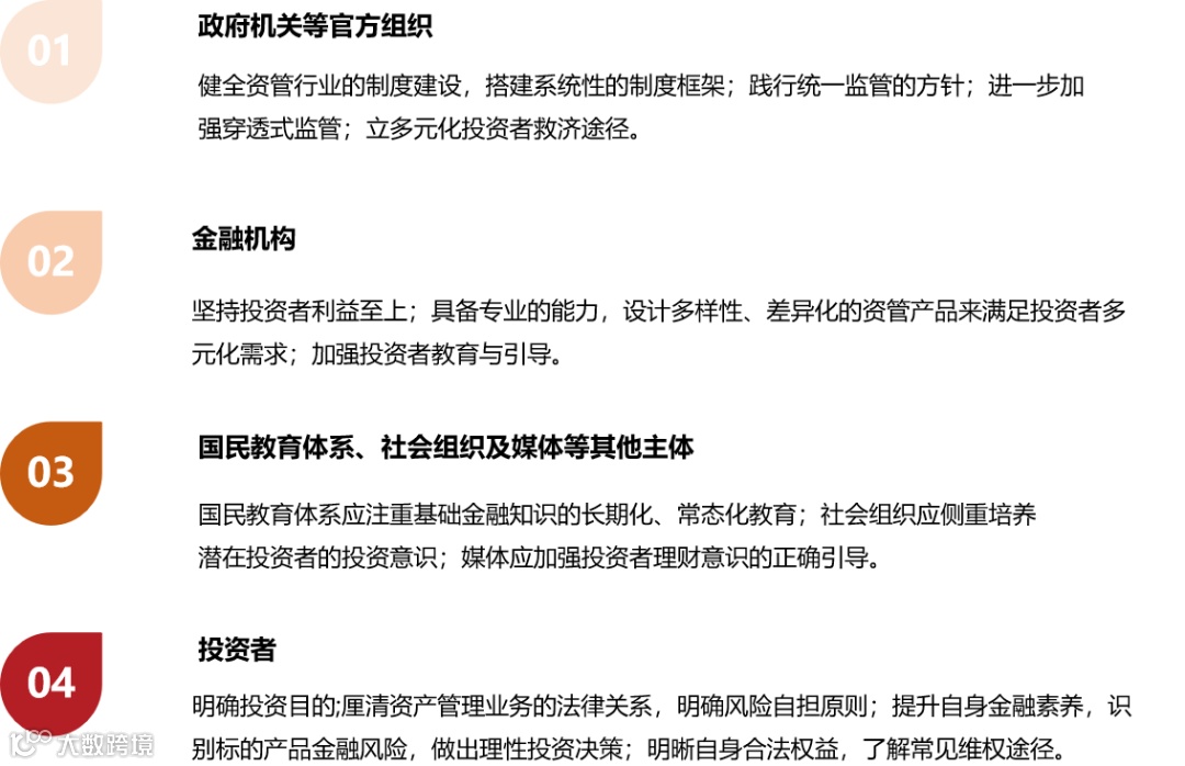 白皮书里提到培养健康的投资文化,这次白皮书总结出来一些解决方案(见图2),首先是关于政府机关的官方组织,然后金融机构一起来共同践行,然后国民教育体系一起来落实,最后投资者完善认知。