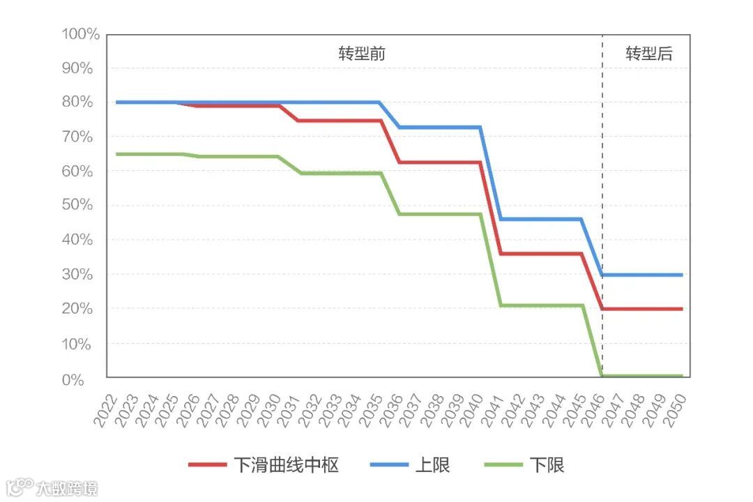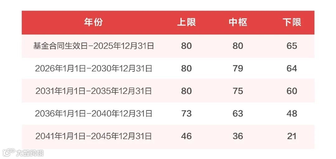 在目标日期前,东方红养老目标2045五年持有混合发起(FOF)根据下滑曲线确定权益类资产和非权益类资产的配置比例。比如:从基金合同生效到2025年底,权益资产配置比例中枢为80%,2026年至2030年权益资产配置比例中枢为79%,之后每五年一个区间,权益资产中枢持续下降,2041年至2045年,权益资产配置比例中枢只有36%。