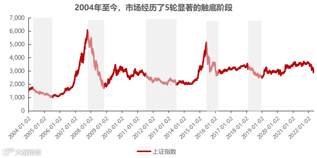 2004年至今,A股过往曾出现过5次显著的低点阶段,虽然每次低点的成因不同,但我们可以从几个角度来观察其中共同的特征。