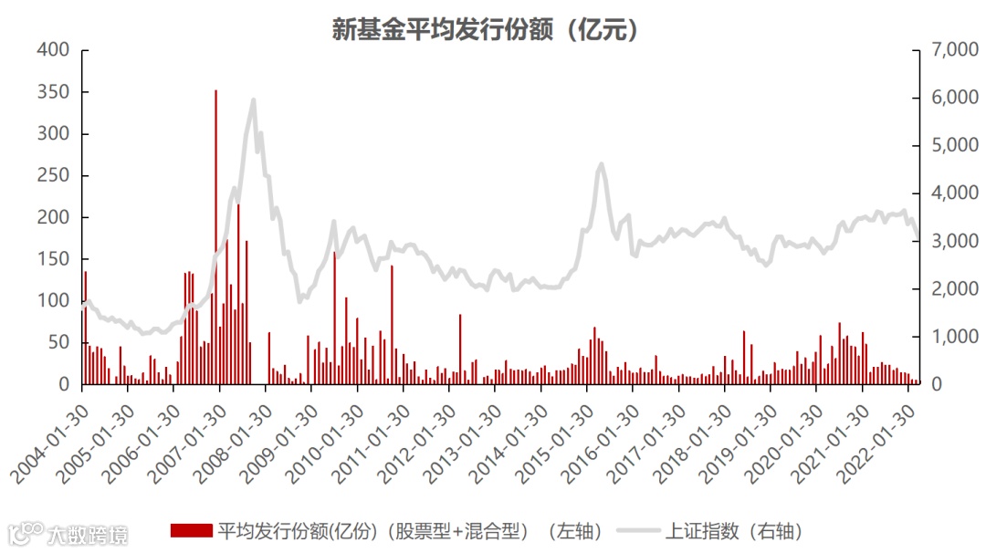 注:数据来源Wind,新基金包括普通股票型基金+混合型基金,2004.1.-2022.4,按基金认购起始日计算