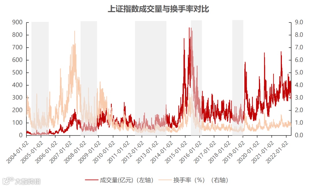 成交量和换手率是投资者情绪和市场活跃度的重要体现,过往的历史底部往往诞生于市场悲观情绪的极点,此时成交量和换手率也会大幅减少,市场几乎无人问津。