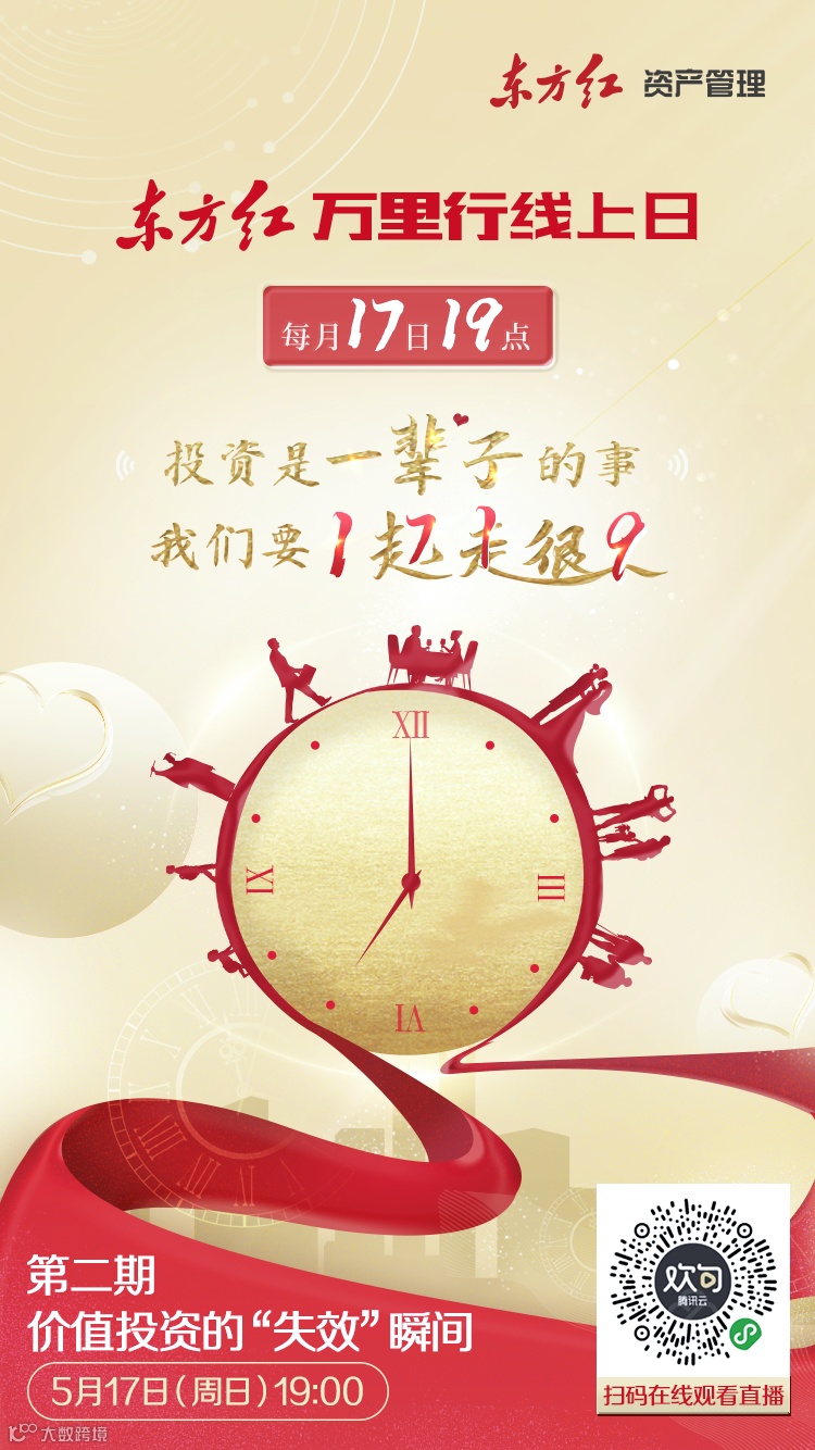 为了陪伴您一起度过市场周期,更好地进行投资理念的交流分享,我们将每月17日19点设为“东方红万里行线上日”,通过线上直播的方式与您分享价值投资的相关理念。我们选择这一时间的寓意在于,我们希望投资是一辈子的事,我们要一起(17)走很久(9)。