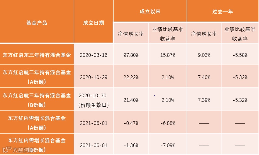 截至目前,李竞管理着东方红启东三年持有混合基金、东方红睿和三年定开混合基金,以及由大集合产品转型而来的东方红启航三年持有混合基金、东方红内需增长混合基金。