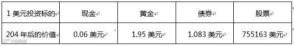 如下表所示,放眼美国资本市场,1802年的1美元,如果我们一直持有现金,204年后价值(购买力)只有0.06美元,意味着贬值了99.4%;如果持有黄金,剔除了通货膨胀的影响后价值为1.95美元;持有债券,最终价值是1 083美元,持有股票,最终价值是75万美元。