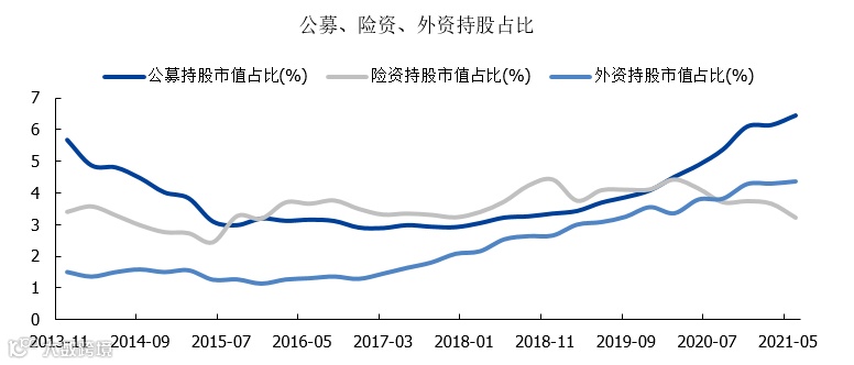 二是机构资金边际推动力量减弱:过去几年,机构力量由弱到强,机构话语权提升,以外资为代表的机构资金在市场中占比大幅提升。但随着市场与机构体量扩容,资金的边际推动力量有所减弱,即使绝对流入金额并未大幅下降,其占A股流动市值的比例也已经出现小幅回落;公募资金的增长也出现边际放缓。