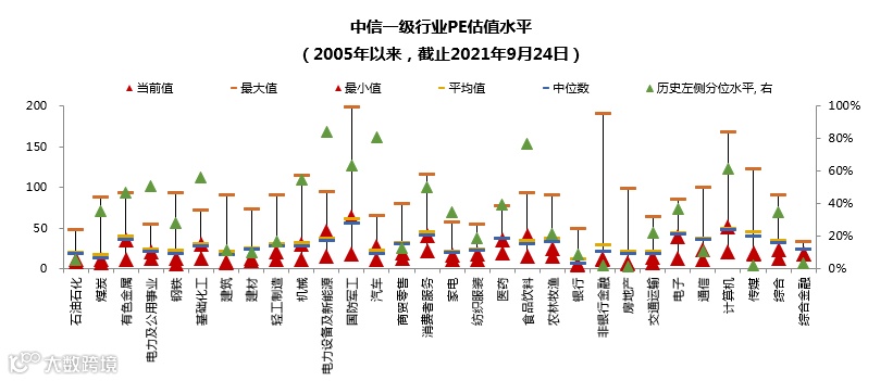 从行业估值来看,当前大多数行业估值低于历史中位数的水平。目前主要处于历史接近最高分位的是周期板块、电新:主要是煤炭、有色、电力、化工、机械,均处于历史较高PE分位数,如果从PB角度来看,采掘/化工/有色/机械分别位于80%/98%/98%/82%分位数;而电力设备及新能源、电子从年初就一直维持在高位,电新更是一直维持在97%+的历史估值分位数。目前主要处于历史低位的是大金融板块:从PB角度来看,地产/银行/非银分别处于2%/0%/0%的历史估值分位数。目前虽然高,但回调较多的是食品饮料、医药:从PB角度来看,食品饮料/医药都从6月的97%左右分位数分别下滑到9月的80%/72%,其中食品饮料更是回到了2019年初的分位数,医药则是回到了2020年6月的分位数。