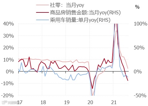 大众消费品均面临较大压力:社零中占比最高的汽车今年其实景气尚可,由于缺芯原因目前库存较低,终端进行了一定涨价。除汽车外的其他消费品压力均不小,无论是地产链上的可选消费品,还是餐饮这类服务业,都面临较大冲击。由于受到居民消费意愿的影响,受疫情影响较小的线上零售同样面临压力,1-8月累计增速下行至13.1%,预期可能还会持续到年底。