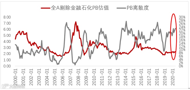 PB的离散度衡量各行业间PB的分化程度,PB离散度=各行业PB所处自身历史分位数的方差;目前市场所处的状态处于极端状态,历史上分久必合,均值回归;分化-回归的路径在目前的演绎下,更倾向于低估值补涨。