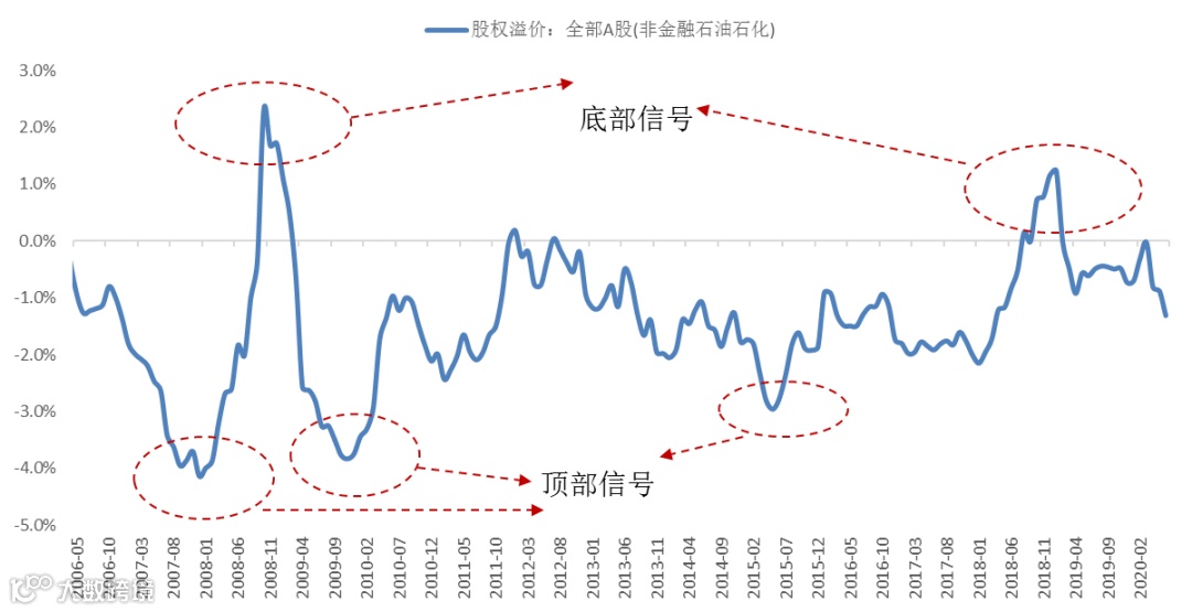 股权溢价=全A剔除金融石化的EPS/Price-无风险利率-信用利差;衡量是股-债的资产比价。