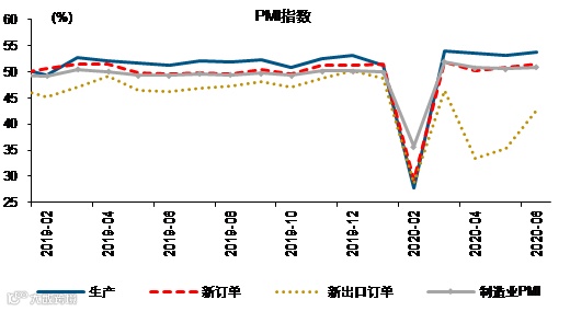 伴随国内疫情平复,经济活动已经处于渐进修复通道,PMI指数连续4个月处于扩张区间,6月收于50.9%。
