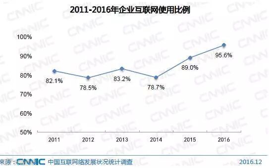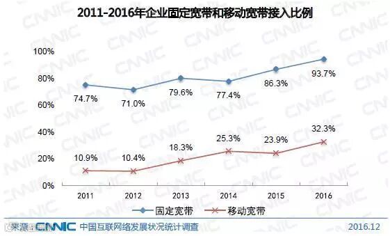 截至2016年12月,通过固定宽带接入方式使用互联网的企业比例为93.7%,通过移动宽带接入互联网的企业比例达32.3%,相比2015年上升8.4个百分点。