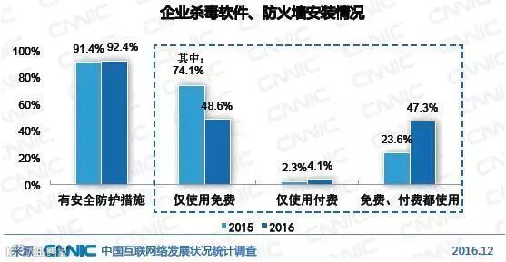 截至2016年12月,有92.4%的企业采取了基本的网络安全防护措施。网络安全议题备受关注,企业需求日益迫切、要求逐渐提高,在网络安全保障方面的投入也随之不断增加。调查显示,在杀毒软件、防火墙上付费的企业(包括仅适用付费和免费、付费都使用)比例达51.4%,相比2015年增加超过25个百分点。