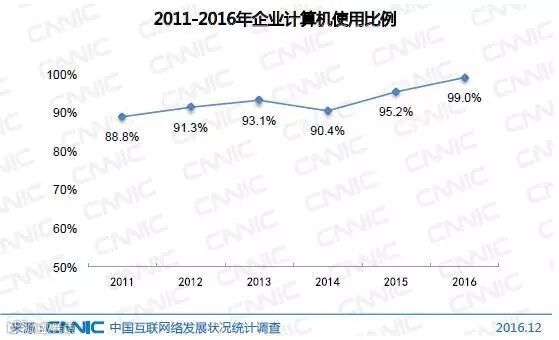 截至2016年12月,全国使用计算机办公的企业比例为99.0%。经过多年发展,中国企业已基本实现计算机的普及应用。