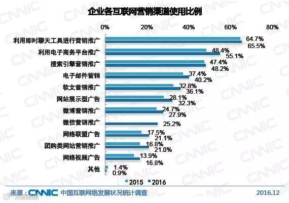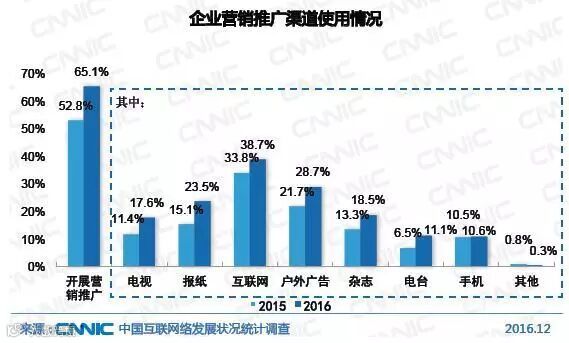 截至2016年12月,利用互联网开展营销推广活动的企业比例为38.7%。互联网已经成为企业不可或缺的营销推广渠道,并在传统媒体与新媒体加快融合发展的趋势下,扮演着关键角色。