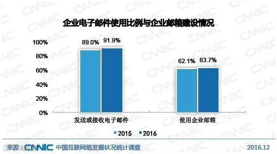 截至2016年12月,在接入互联网的企业中,有91.9%在过去一年使用过互联网发送或接收电子邮件,其中有63.7%的企业建有企业邮箱。