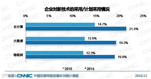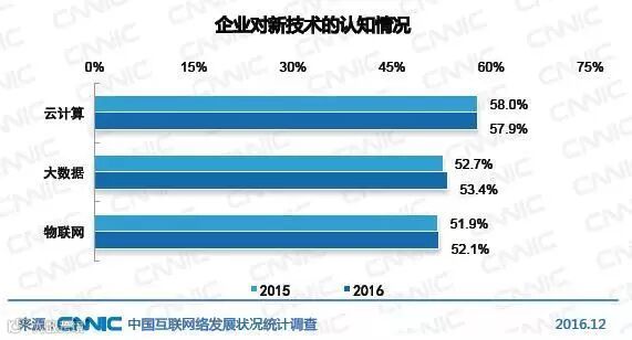 调查结果显示,受访企业对云计算、物联网与大数据三类新技术的认知比例分别为57.9%、53.4%和52.1%,与2015年持平。
