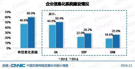 截至2016年12月,60.0%的上网企业部署了信息化系统,相比2015年提高13.4个百分点。其中分别有50.4%、28.2%和25.9%的企业建有办公自动化(OA)系统、企业资源计划(ERP)系统和客户关系管理(CRM)系统。