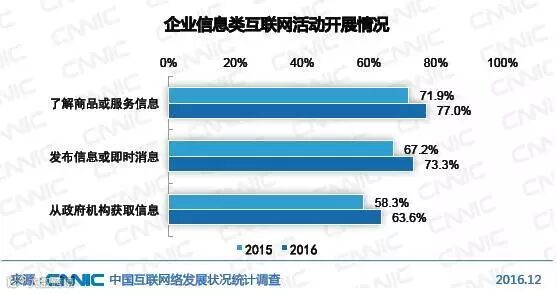 截至2016年12月,86.4%的上网企业使用网上银行;82.3%的上网企业在互联网上与政府机构互动、在线办事;使用互联网辅助基本人力资源管理的企业比例相比2015年有所上升,开展网络招聘、在线员工培训的企业比例分别达61.7%和31.9%。
