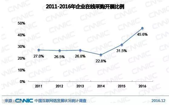 截至2016年12月,全国开展在线采购的企业比例为45.6%。得益于互联网金融、云服务等新兴企业级服务市场的法杖,服务于企业采购的电子商务平台正在向集信息流、资金流、物流于一体的综合性供应链协同服务平台转型,企业的在线采购流程更加便捷、安全。