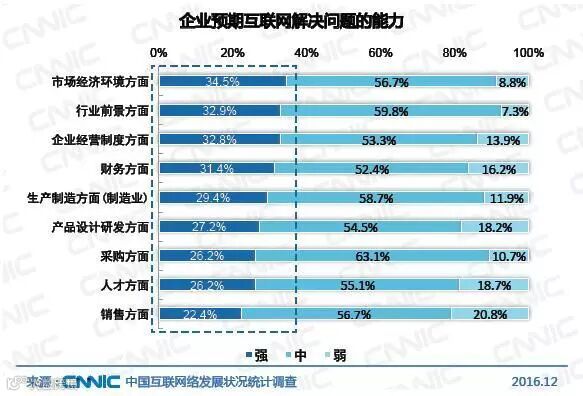 调查结果显示,当问及互联网能否帮助解决各项经营管理问题时,越来越多企业表示认可。2016年,企业对互联网在市场经济环境、经营制度、财务、生产制造方面发挥作用的预期显著变强。与2015年相比,企业对互联网所能发挥的作用有较强预期的比例均出现提高,但对不同的问题的排序有所变动:采购、销售、人才问题排序下降,经营制度、财务、生产制造的排序上升,反映出互联网解决企业核心问题的能力正在提高。