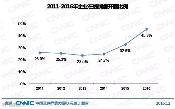 截至2016年12月,全国开展在线销售的企业比例为45.3%。“十二五”期间,中国电子商务市场快速发展,交易额翻两番。2016年作为“十三五”的开局之年,电子商务市场规模依然保持稳健增速,企业的参与程度持续深入,开展在线销售的比例大幅提高。