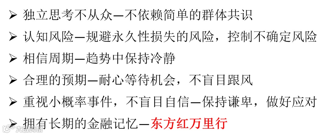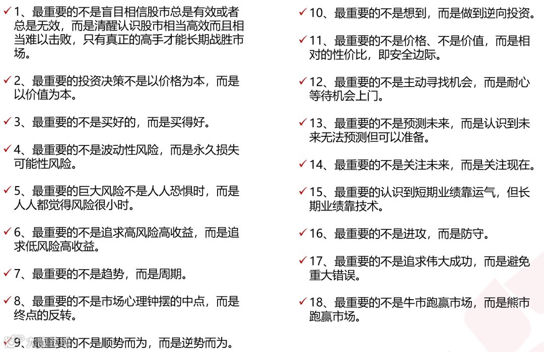 黄金法则:多数事物都是周期性的;当上条被忘记时,最大的盈亏机会就会到来。世界具有周期性的根本原因是人类的参与。人们对客观因素的反应过度或不足,决定了周期性波动的幅度。无视周期并推算趋势是投资者所做的最危险的事情之一。
