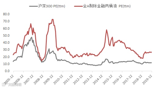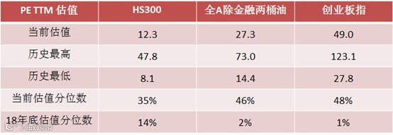 当前A股市场整体估值位于合理区间。以沪深300指数、全A指数(除金融和两桶油外)、创业板指数为例,截至2019年12月27日,目前三者的PE(TTM)分别为12.3倍、27.3倍、49.0倍;三者的估值分位数分别为35%、46%、48%,均位于1/2以下分位。