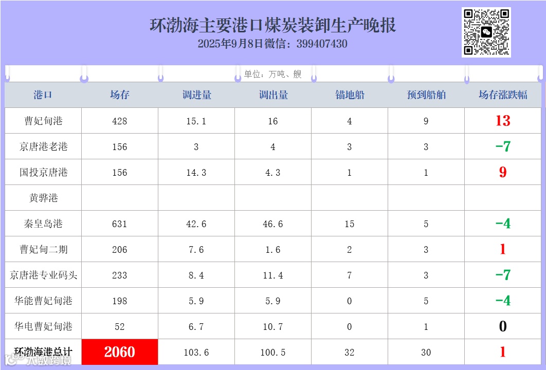 环渤海主要港口煤炭装卸生产晚报