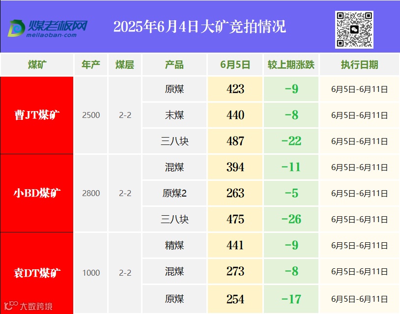 惠宝煤矿:2025年6月5日现金售价:原煤↑5