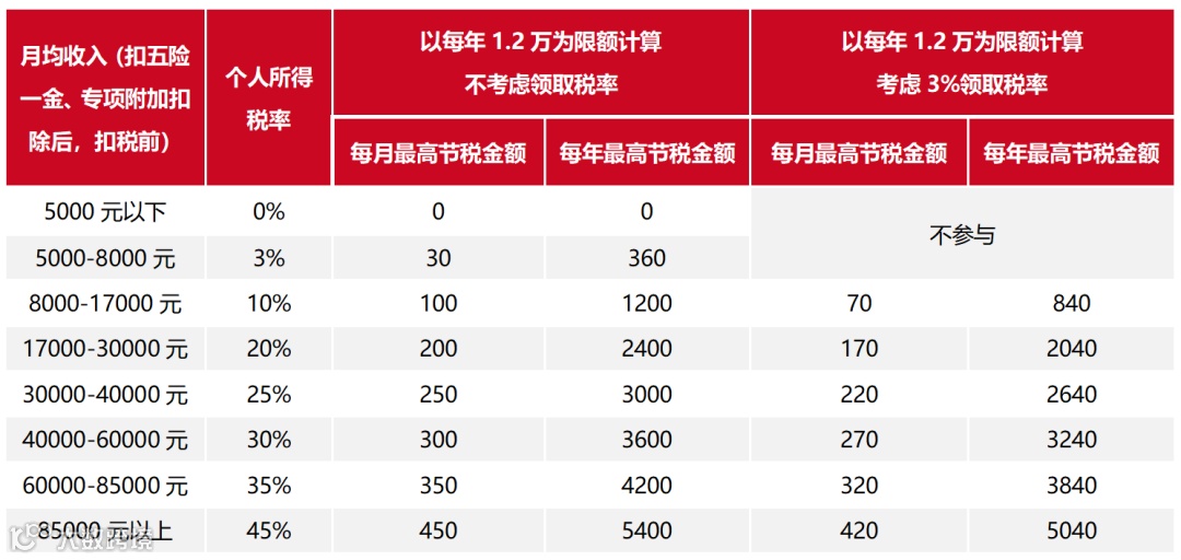 举个例子,如果考虑3%领取税率,月均收入为2万元,每年将1.2万元投入个人养老金账户中,待满足领取条件时,这12000元只需缴纳360元税相当于节省了2040元所得税。