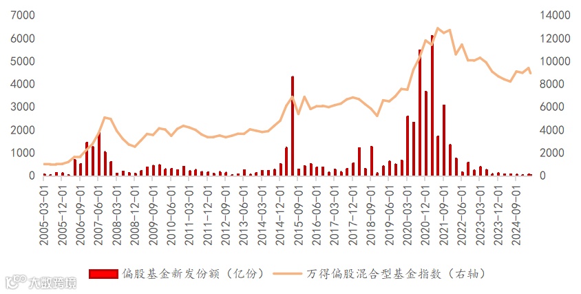 净值回调后、估值已经非常便宜,理财经理来推荐了——“NO、NO、NO,看这净值最近跌的……,买了后再跌这么多该怎么办”——线性外推、根据过往表现来推测未来,这是人的天性。看看下图,股市行情与偏股基金首发销量呈明显的反比关系,就知道大部分人是在什么时候决定下单买偏股基金的: