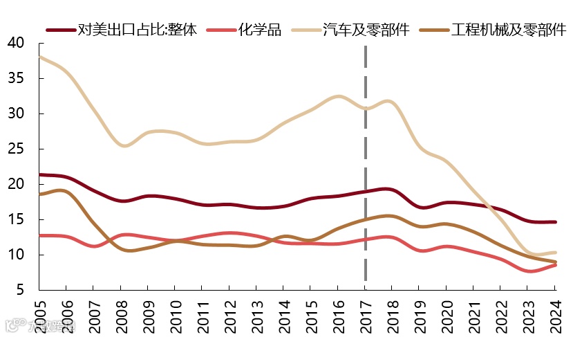 我国对外依存结构优化,对美依赖显著降低,主要体现贸易多元化和投资分散化:对美出口占中国出口比重从2018年的19.2%降至2024年的14.7%,其中汽车及其零部件、化学品、工程机械等重点品类分散化特征明显;同时,企业对东盟直接投资存量占比持续提升(不含港澳),区域布局优化,对美敞口收窄,且供应链话语权增强使美国难以实现硬脱钩。