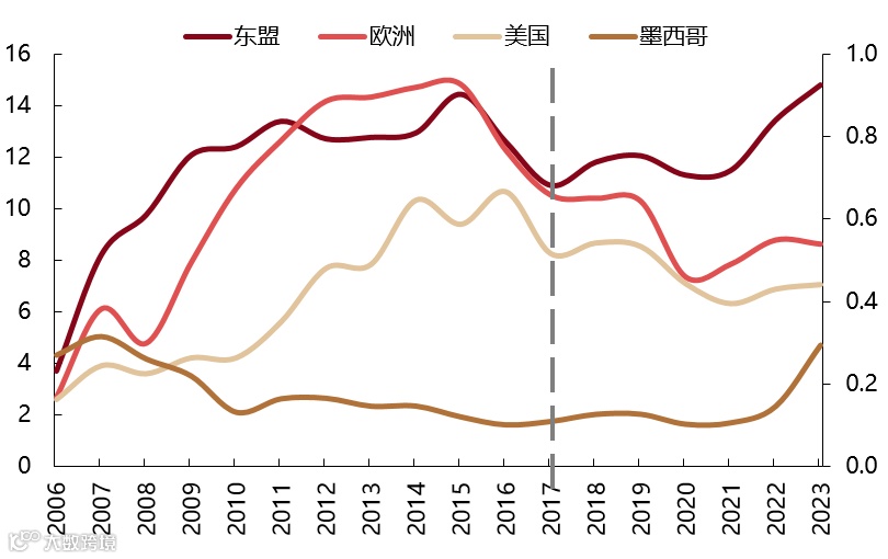 图:对东盟直接投资存量占比提升(%,不含港澳)