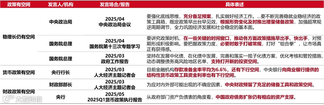 中国政策空间仍存,国务院及央行多次强调“必要时敢于打破常规”,但政策呈现应对式、后置性特征,4月中央政治局会议明确锚定“稳就业、稳企业、稳市场、稳预期”,5月12日中美互降关税提供的约90天政策窗口期,进一步降低了短期发力紧迫性,政策调整将优先观察贸易谈判进展。