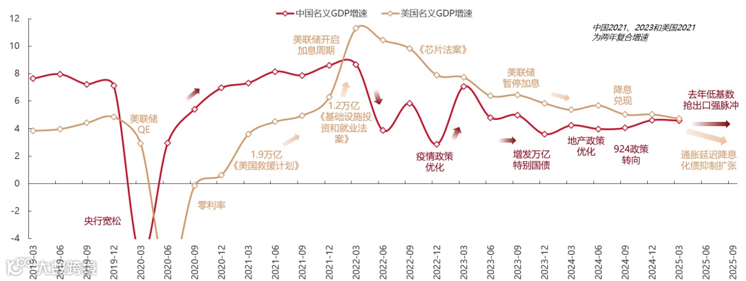 短期来看,中国经济走出周期低位仍需时日。外需方面,“抢出口”效应消退后,伴随关税上行,美国进口需求或回落,出口增速可能在三季度后趋势性下滑,制造业投资增速或随出口见顶。内需同样面临考验,社零增长依赖耐用品消费补贴,去年国补品种贡献约30%同比增速,但今年9月起高基数效应或使社零增速于8月见顶。物价压力犹存,5月PPI同比降幅扩大至-3.3%,汽车制造业PPI连续33个月同比负增长。综合来看,内外需或于三季度同步走弱,可能使名义GDP增速承受更大压力,短期存在波动风险。