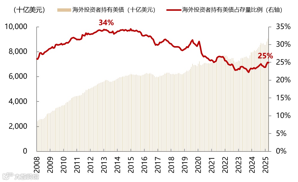 图:外国投资者持有美债占存量比例下降至25%