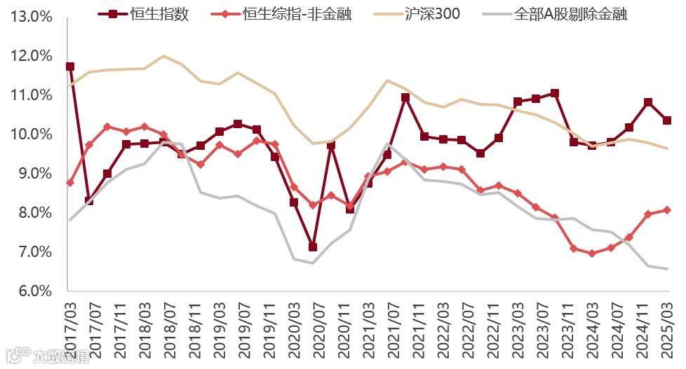 基本面角度来看,港股具有相对优势。新经济板块(科技/医药/消费)占比提升至56%,高于A股的42%。截至2025年一季度,恒生指数ROE(TTM)达10.4%,领先沪深300的9.6%;剔除金融后,恒生综指(非金融)ROE也优于全A(非金融),在PPI下行期更具盈利韧性。