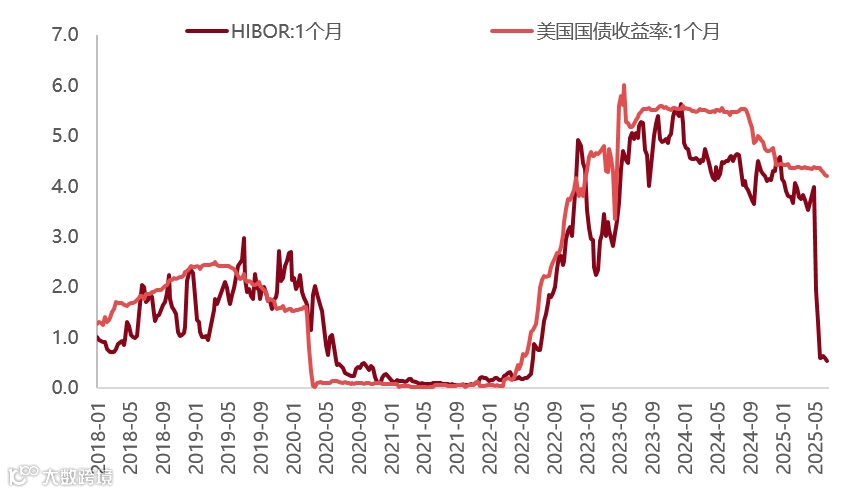 图:港元Hibor利率与美元利率罕见地大幅背离