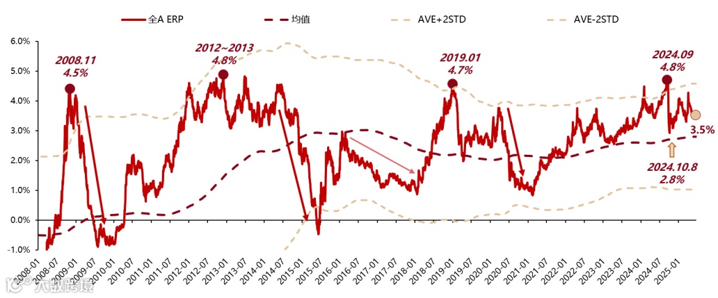 当前A股估值逐步消化,全A的PE(TTM)为19.6倍,处于2010年以来64%分位数,较去年10月8日高点回落;风险溢价(ERP)约3.5%,处于均值+1倍标准差附近,高于去年10月8日的2.8%。但风险溢价回归均值需盈利改善(如2016-2017年)或政策大幅宽松(如2014-2015年),目前条件尚未具备。