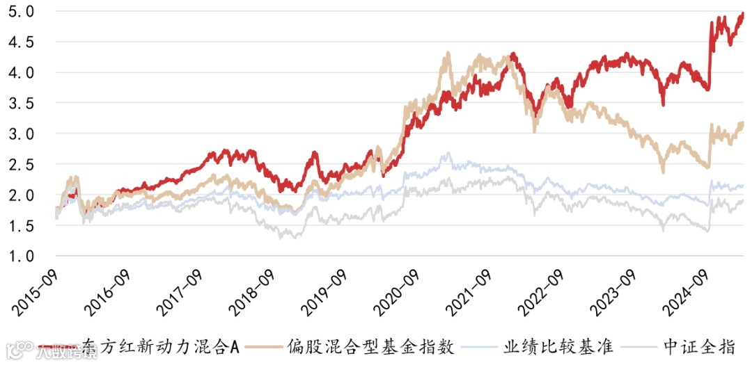 这个新高并不是因为押注了近期的热门赛道,更多是稳扎稳打,步步为营,从近几年的年度表现即可见一斑。东方红新动力混合A在2022-2024年的净值增长率分别为-11.04%、6.72%、15.14%,都跑赢同期偏股混合型基金指数(-21.03%、-13.52%、3.45%)和中证全指(-20.32%、-7.04%、7.43%)(详见文末备注)。