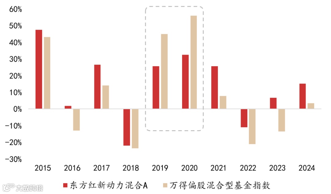 图:东方红新动力混合A与偏股混合型基金指数年度表现