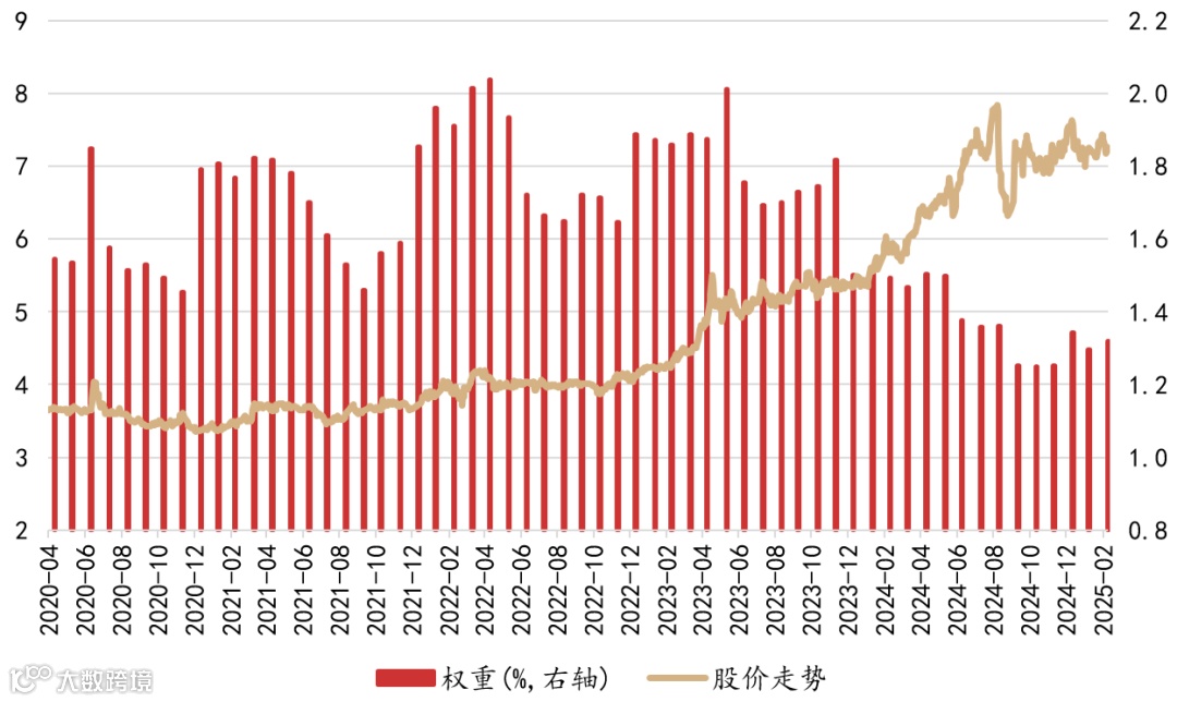 以交通银行为例,该股票是东证红利低波指数的初始样本,发布后一直在指数中,且近四年表现较好。通过数据可以观察到,随着股价的逐步上涨,其在指数中的权重震荡下行,相比发布之初有了较大幅度的下调。