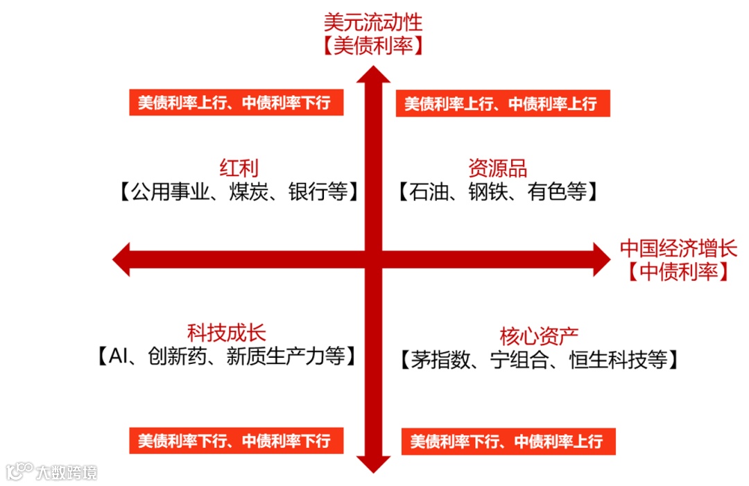 在经济增速放缓阶段,投资者倾向于缩短资产久期;而进入经济、盈利企稳复苏阶段,核心资产往往率先企稳并迎来修复,投资逻辑从防御转向进攻。上半年中债利率下行+美债利率上行,红利资产短久期、低增长,一定程度上具有“类现金”的特征,且受美债影响较小,因此较受欢迎。随着下半年国内经济预期改善,且美中利差有望收敛,那么以茅指数、宁指数、恒生科技为代表的核心资产更加值得关注。在中债利率企稳之前,科技成长也有机会。