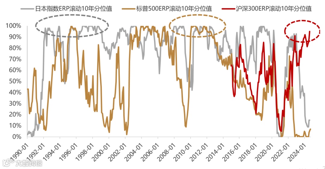 市场风险偏好低是本轮资产配置最重要的宏观原因,股债分位数剪刀差已达到历史极端高位。其中十年期国债利率的历史分位数是2002年以来最低的位置,但万得全A的风险溢价(ERP)则维持在90%以上的极高位置。ERP长期处于高位的一情景与90年代的日本、2008年~2012年的美国较为相似,背后的原因可能是经济增速换挡的背景下,实体部门对中长期预期发生变化,风险资产缺乏信用背书。